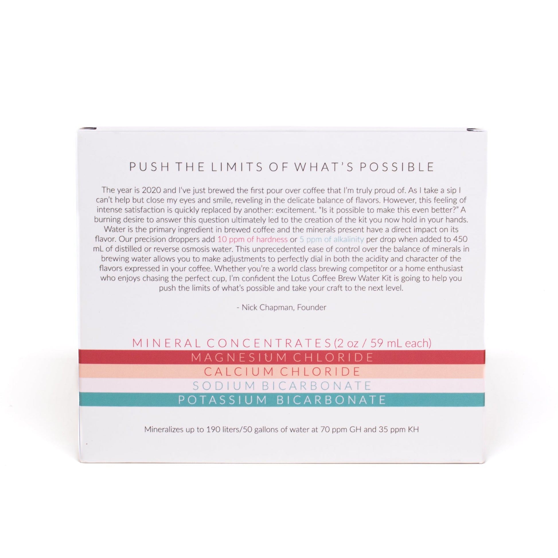 Elevate every cup of coffee by mastering the mineral balance of your brewing water. Lotus Water gives you the power to highlight your coffee’s most appealing notes while muting any off-flavors—all by simply adjusting your water’s composition. Each Lotus Water kit includes four precisely measured mineral infusions and a convenient mixing bottle. Follow our easy, online recipes to explore how different mineral balances can transform the flavor profile of a single coffee, revealing nuances you never knew existed. Take control of your coffee’s taste from the very first drop with Lotus Water.